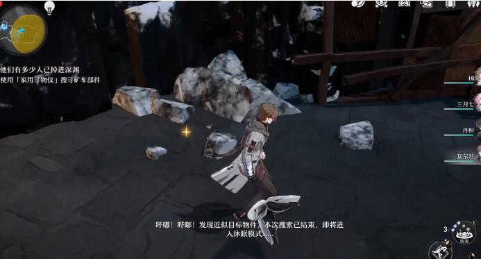 3、多放置几个后,没多久就会看见寻物仪给到我们提示,已将找到了矿车部件。