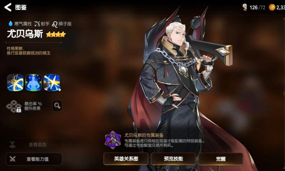 解析:效果命中的面板要有65%以上,速度建议180以上,技能强化依次升级为0/1/6,神器推荐星辰之歌。