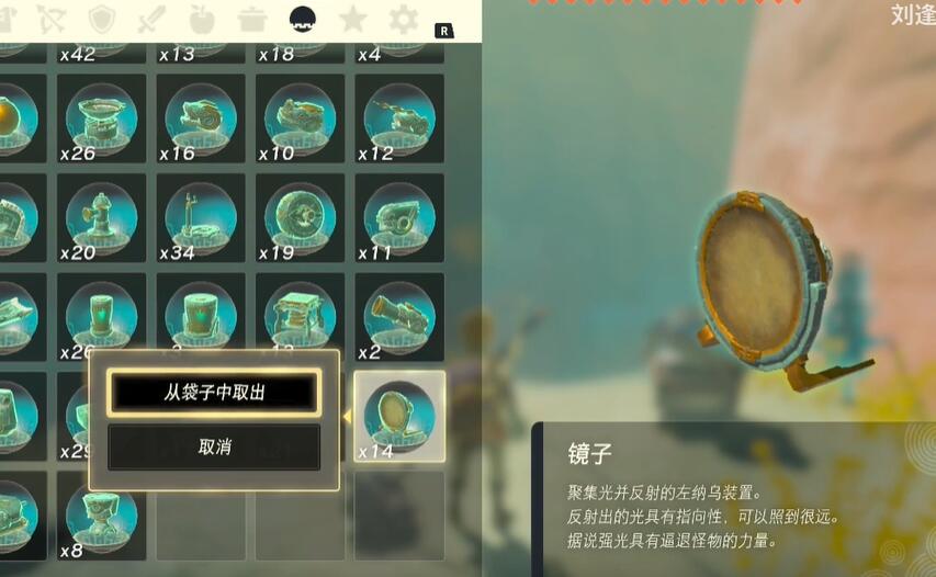 2、接着打开背包,在左纳乌装置找到镜子,取出它。