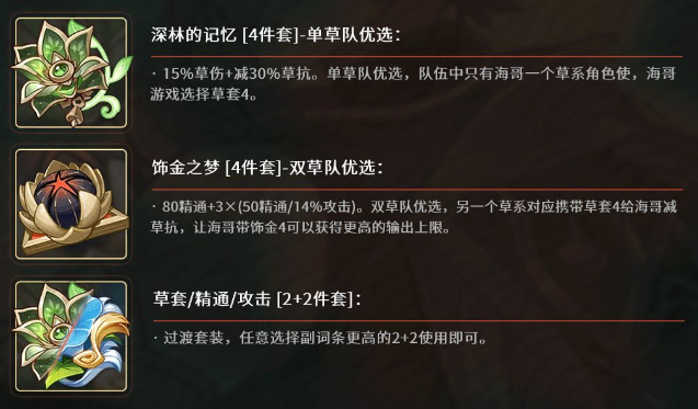 1、圣遗物推荐:【草套4】=【饰金4】>【草套2+精通2/攻击2】