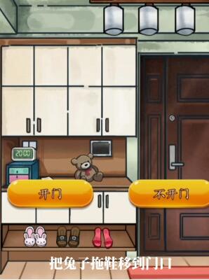 4、在门口了解规则,点击猫眼查看,将兔子拖鞋移动到地毯上,在开门。