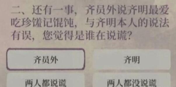 2、还有一事,齐员外说齐明最爱吃珍馐记馄饨,与齐明本人的说法有误,您觉得是谁在说谎?