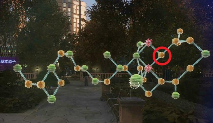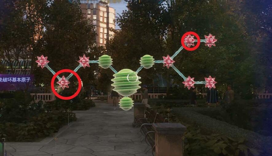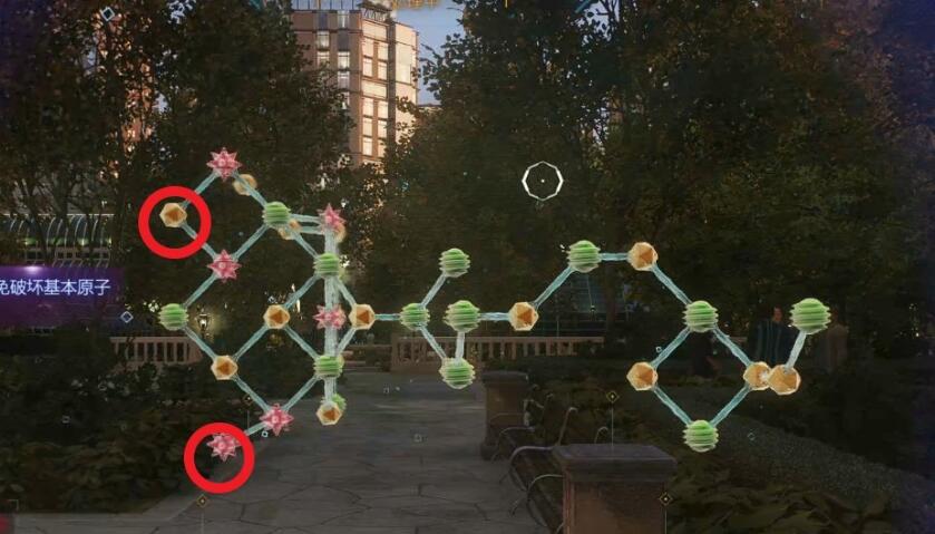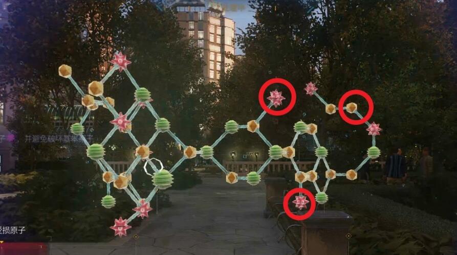 3、接着我们需要进行解谜,破坏受损原子,先点击左边第二个和右上第二个粉球。