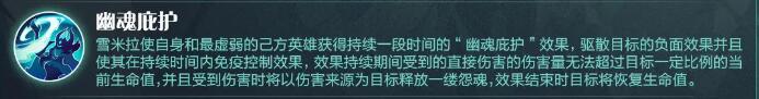 让自身和血量最低的英雄获得幽魂庇护效果,期间免疫控制效果,减少受到的伤害,结束后恢复血量。