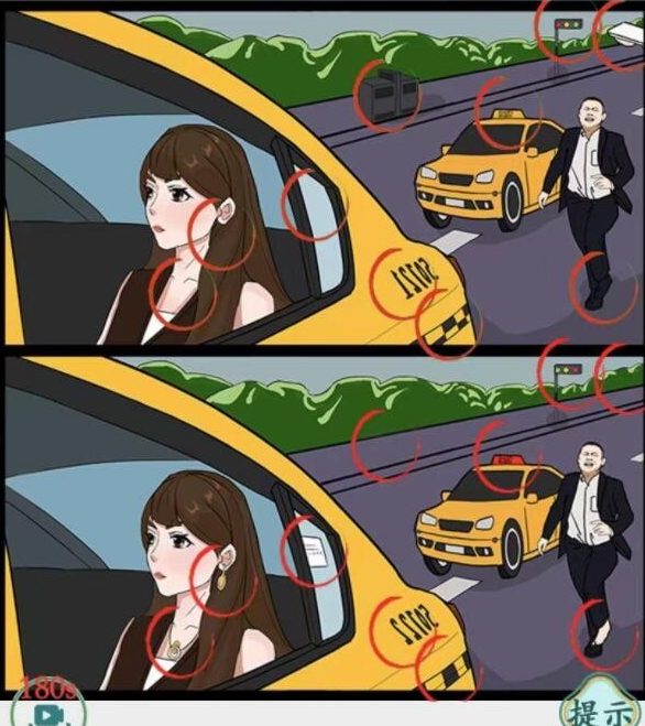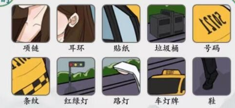 2、鞋,路灯,红绿灯,车灯牌,垃圾桶,耳环,项链,贴纸,号码,条纹这十处是不同的。