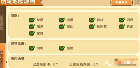 1、首先进入到迷你世界游戏中,选择【开发者模式】,购买所有的地貌、生物创建地图。