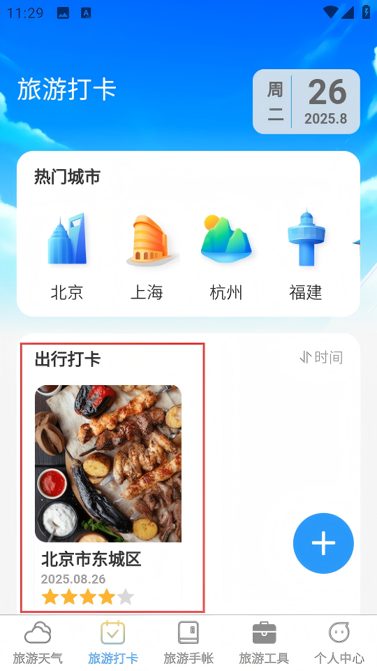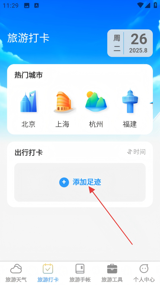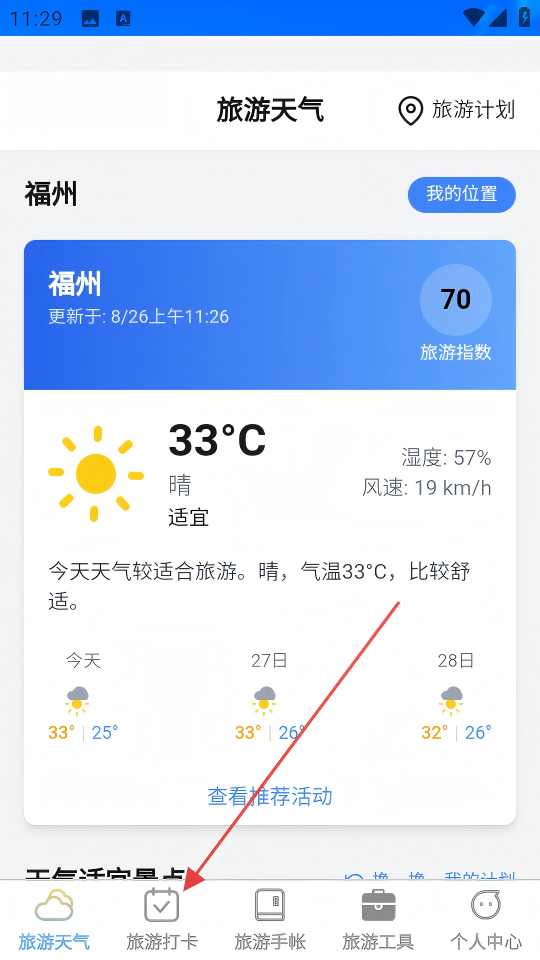 1、打开旅游天气APP,点击底部导航栏的【旅游打卡】,进入打卡页面。