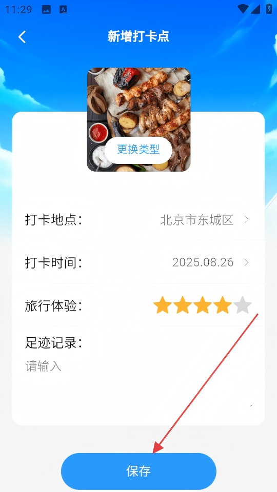 3、填写打卡地点、时间,选择旅行体验星级,输入足迹记录后,点击【保存】。
