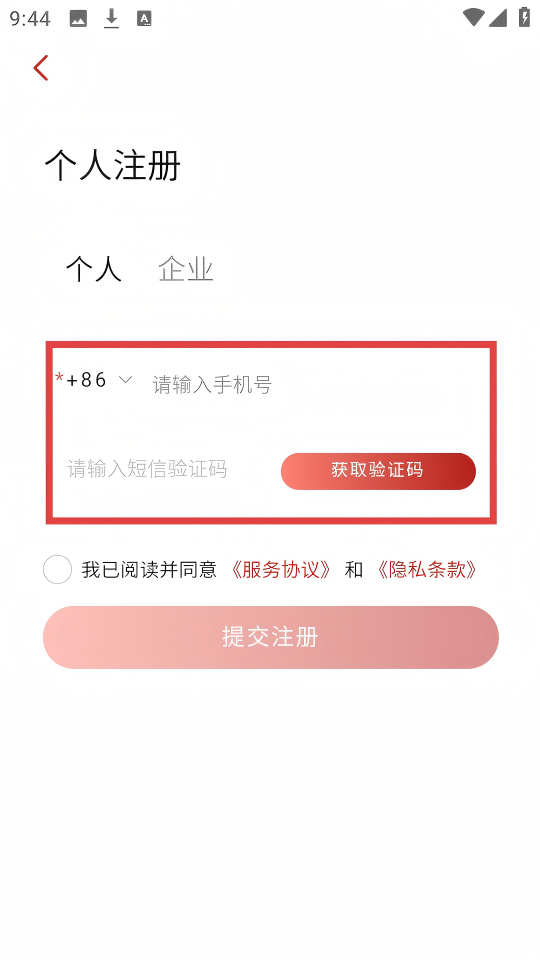 4、在个人注册页输入手机号,点击【获取验证码】并填写,勾选协议后点【提交注册】。