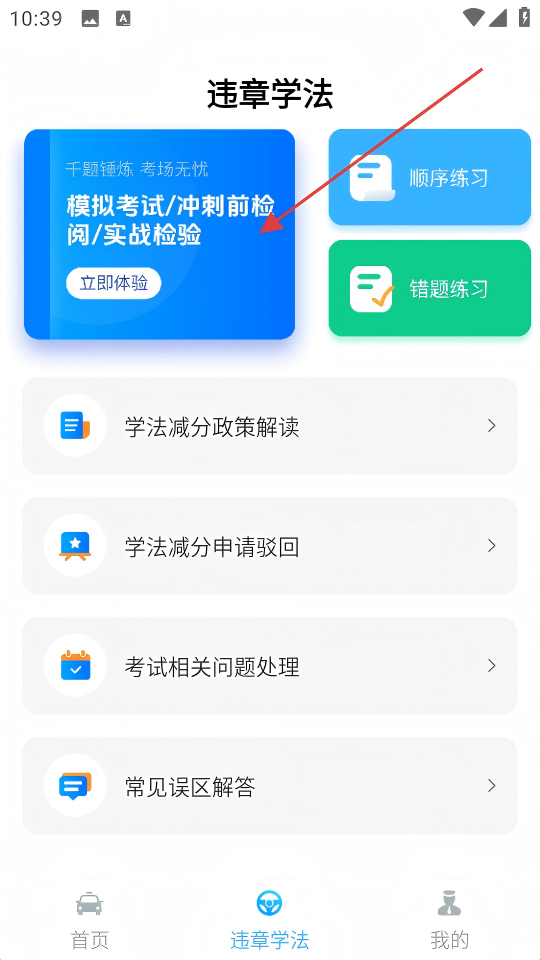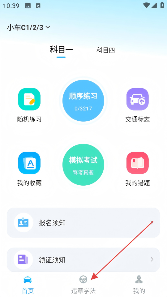 1、在驾考APP首页,点击底部【违章学法】,进入违章学法板块。