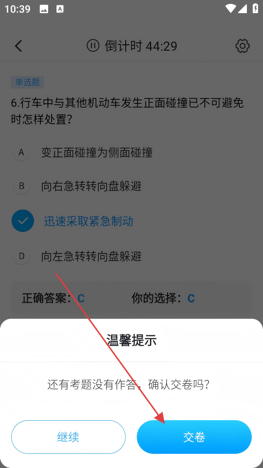 3、答题界面完成作答,点击底部【交卷】按钮,触发交卷提示。