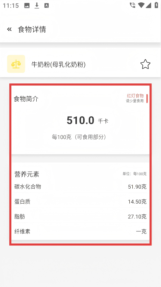4、在食物详情页查看【510.0千卡】及营养元素信息。