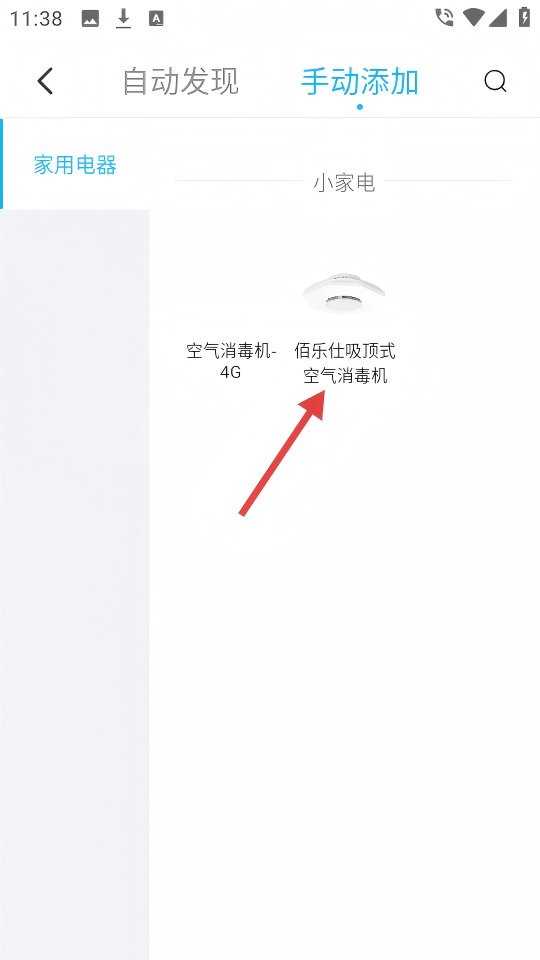 3、在手动添加的家用电器中,选择【佰乐仕吸顶式空气消毒机】进行添加。