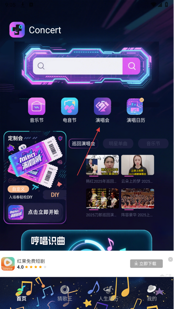 1、在首页,点击【演唱会】,进入演唱会页面。