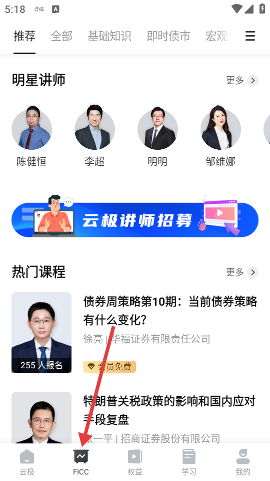 2、进入FICC板块,能查看【明星讲师】及【热门课程】。