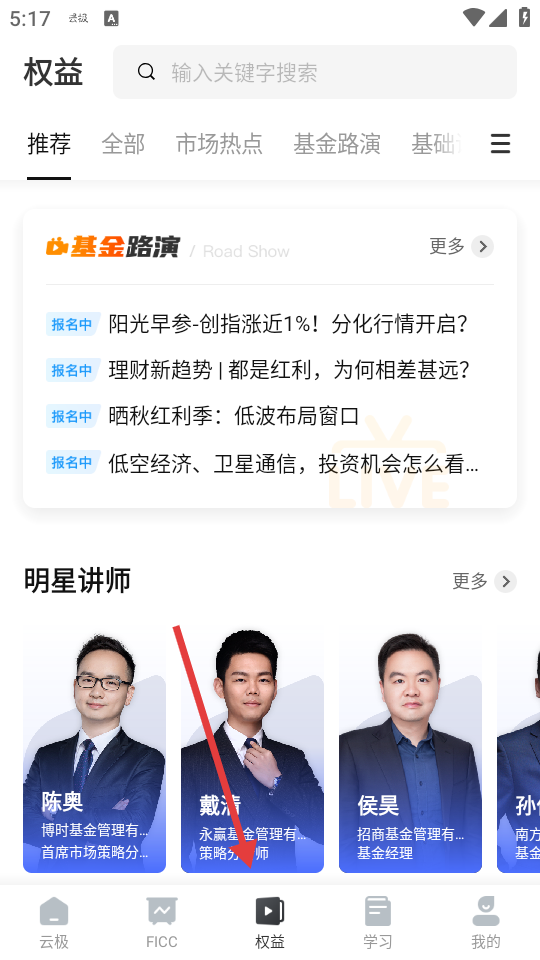 3、在权益板块,可参与【基金路演】,还能了解【明星讲师】相关情况。