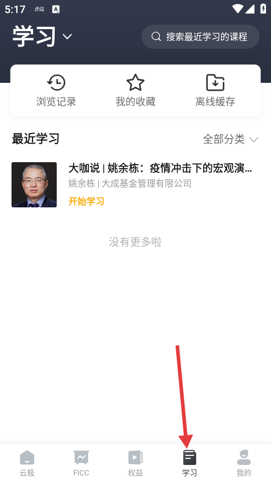 4、点击学习板块,可查看【浏览记录】【我的收藏】【离线缓存】,以及【最近学习】的课程。