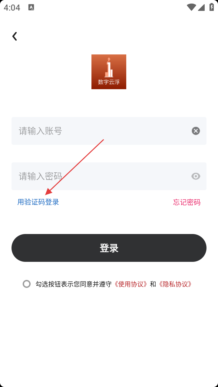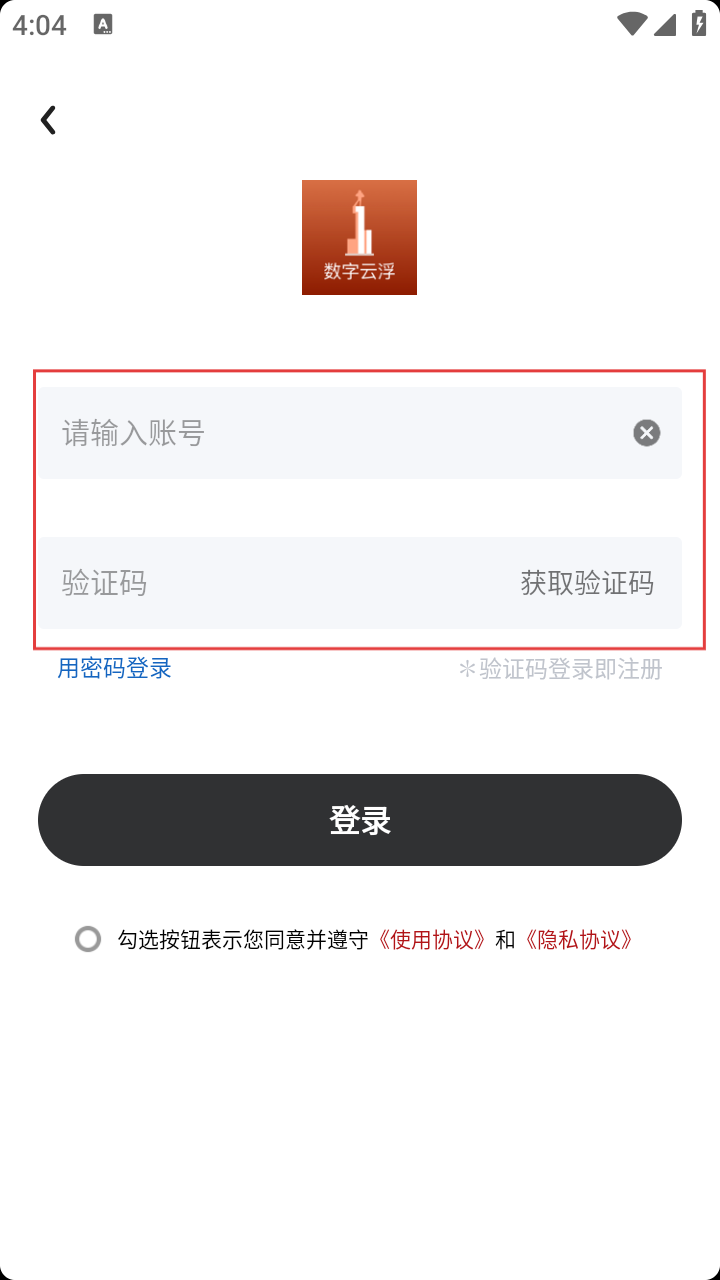 4、输入账号,点击【获取验证码】并输入验证码,勾选【勾选按钮表示您同意并遵守《使用协议》和《隐私协议》】,点击【登录】按钮,完成登录操作。