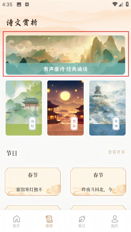 2、进入“诗文赏析”页面,可选择“有声唐诗·经典诵读”等内容。