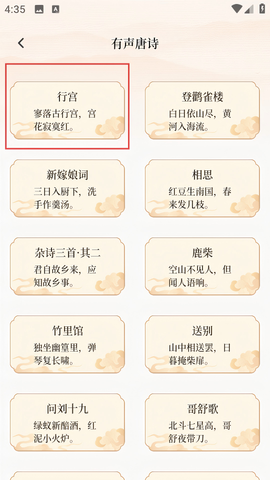 3、进入“有声唐诗”页面,选择具体唐诗,如《行宫》。