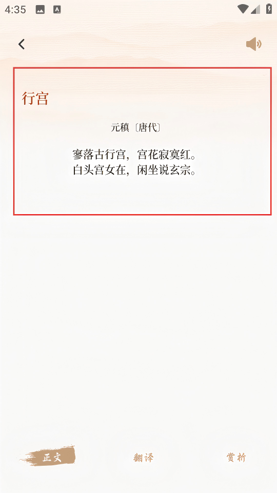 4、进入诗词详情页面,可查看诗词正文,也能点击【翻译】【赏析】,了解诗词的翻译和赏析内容。
