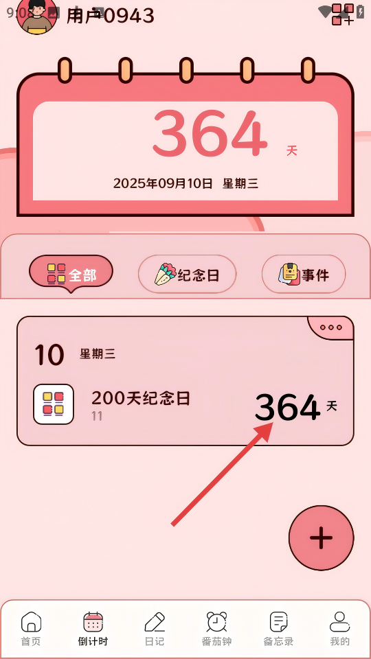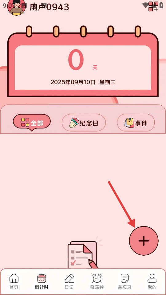 2、在倒计时页面,可点击页面右下角的红色【+】号按钮添加新的事件或纪念日。