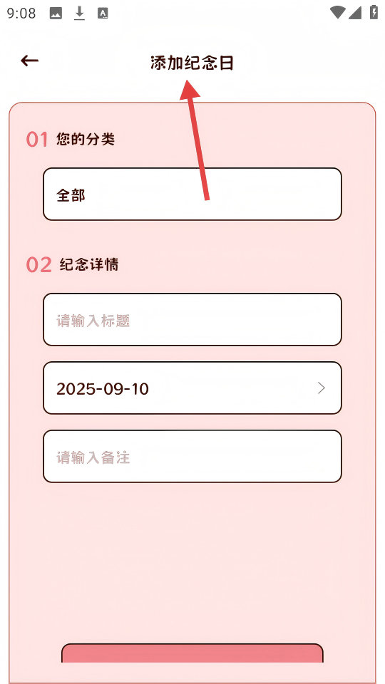3、进入【添加纪念日】页面,可选择分类,在【请输入标题】【请输入备注】框输入内容。