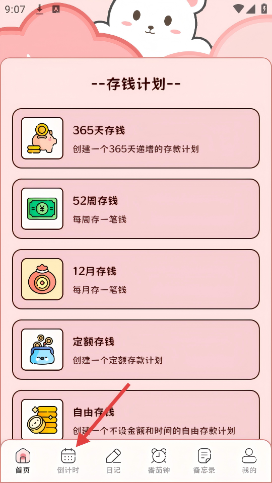 1、在存钱计划页面,点击底部【倒计时】切换页面。
