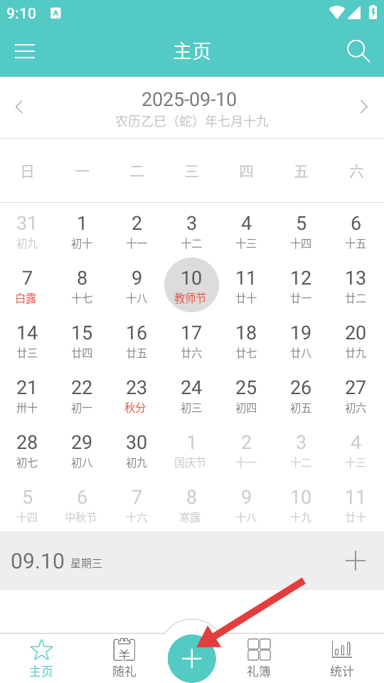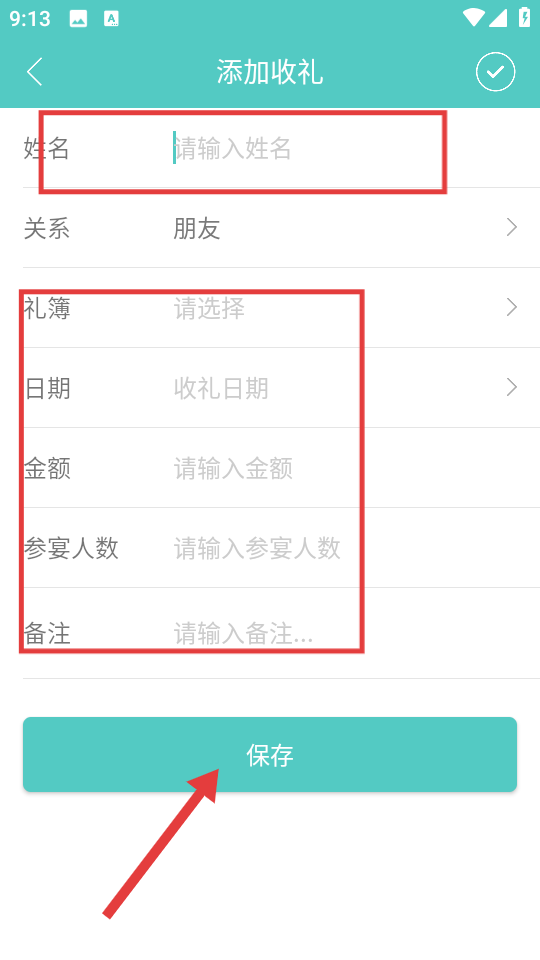 4、进入【添加收礼】页面,输入姓名、日期等信息,完成后点击【保存】按钮。