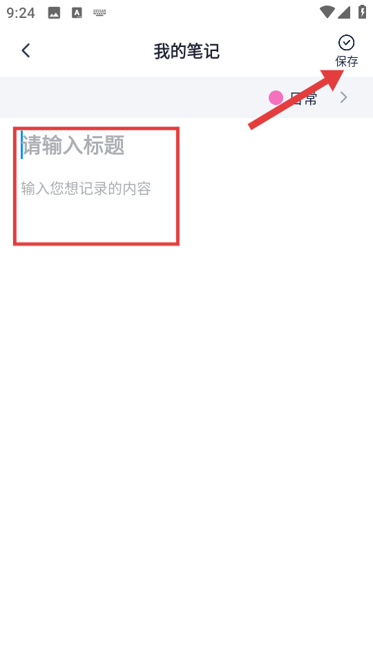4、在【我的笔记】页面,输入标题和想记录的内容,完成后点击右上角【保存】按钮。