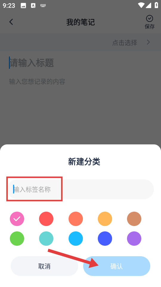 3、在【新建分类】弹窗中,输入标签名称,选择颜色,点击【确认】完成标签新建。