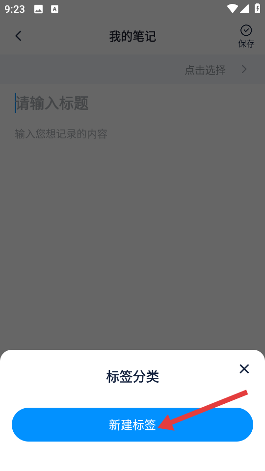 2、在【我的笔记】页面,点击标签选择区域,在【标签分类】,点击【新建标签】。