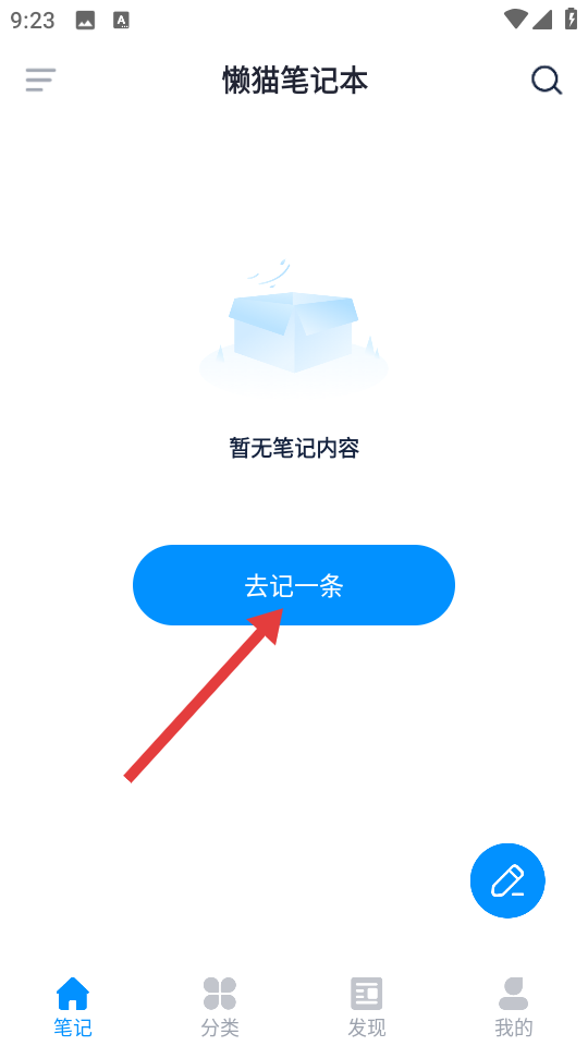 1、进入软件主页面,点击【去记一条】按钮,进入【我的笔记】编辑页面。