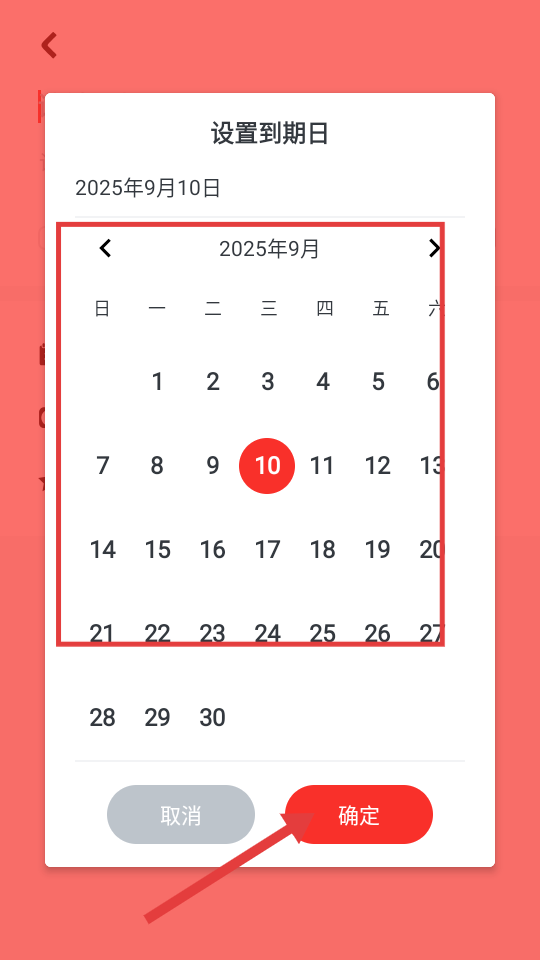 2、在设置到期日弹窗中,选择具体日期,然后点击【确定】按钮,完成到期日设置。