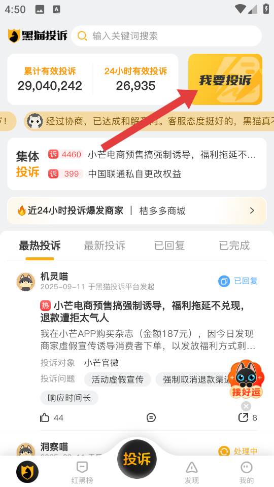 1、在黑猫投诉主页面,点击右上方的【我要投诉】按钮。