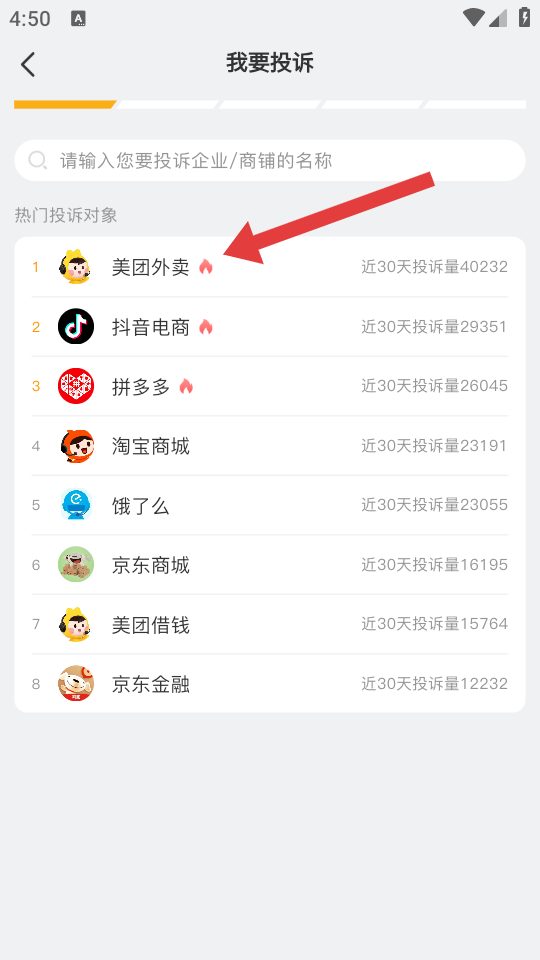 2、进入【我要投诉】页面后,选择要投诉的企业,如【美团外卖】。