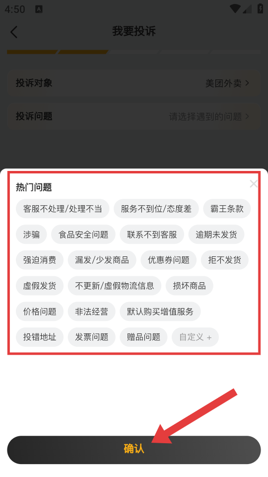 3、在弹出的热门问题中,挑选符合自身情况的投诉问题,点击【确认】。