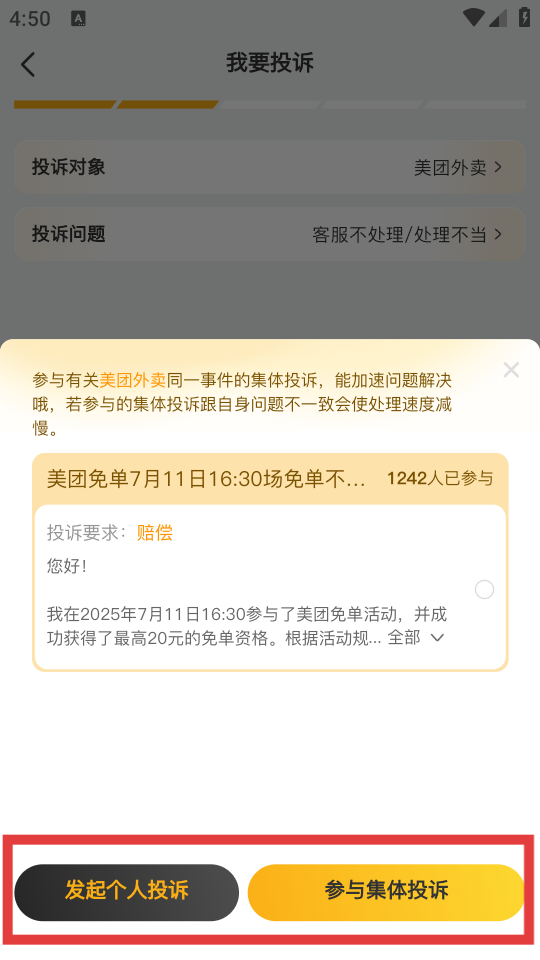 4、根据需求,选择【发起个人投诉】或【参与集体投诉】来提交投诉申请。