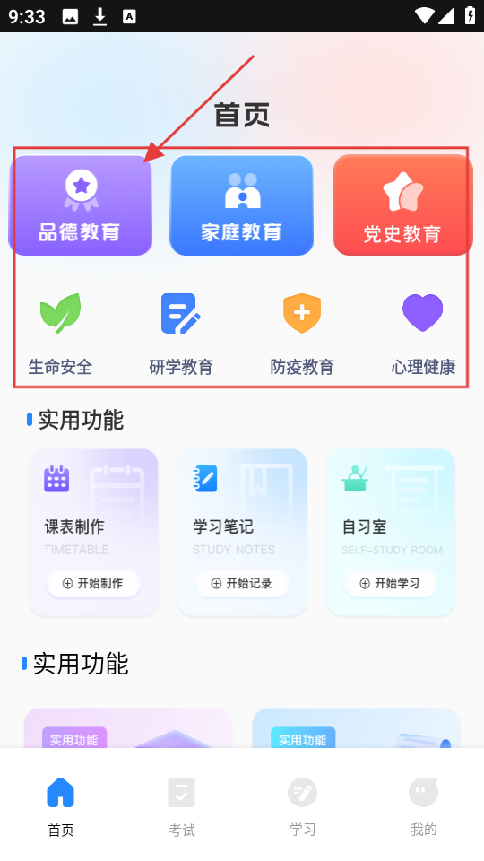1、在首页,可选择【品德教育】【家庭教育】等分类,进入对应教育内容页面学习。