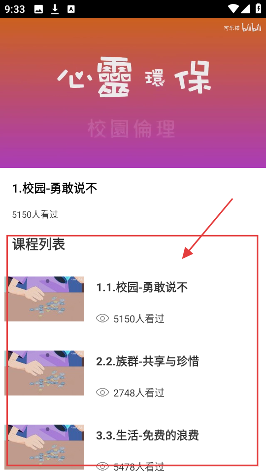 2、进入课程页面后,在课程列表选目标课程,如【校园-勇敢说不】,开始学习相关内容。