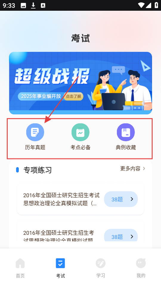 3、在考试页,点【历年真题】,进入历年真题页面,可查看各类考试真题。