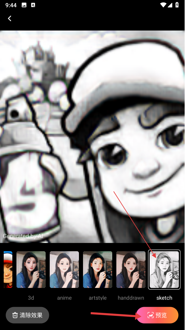 3、选择好图片后,挑选【喜欢的卡通风格】,点击【预览】,查看卡通化效果。