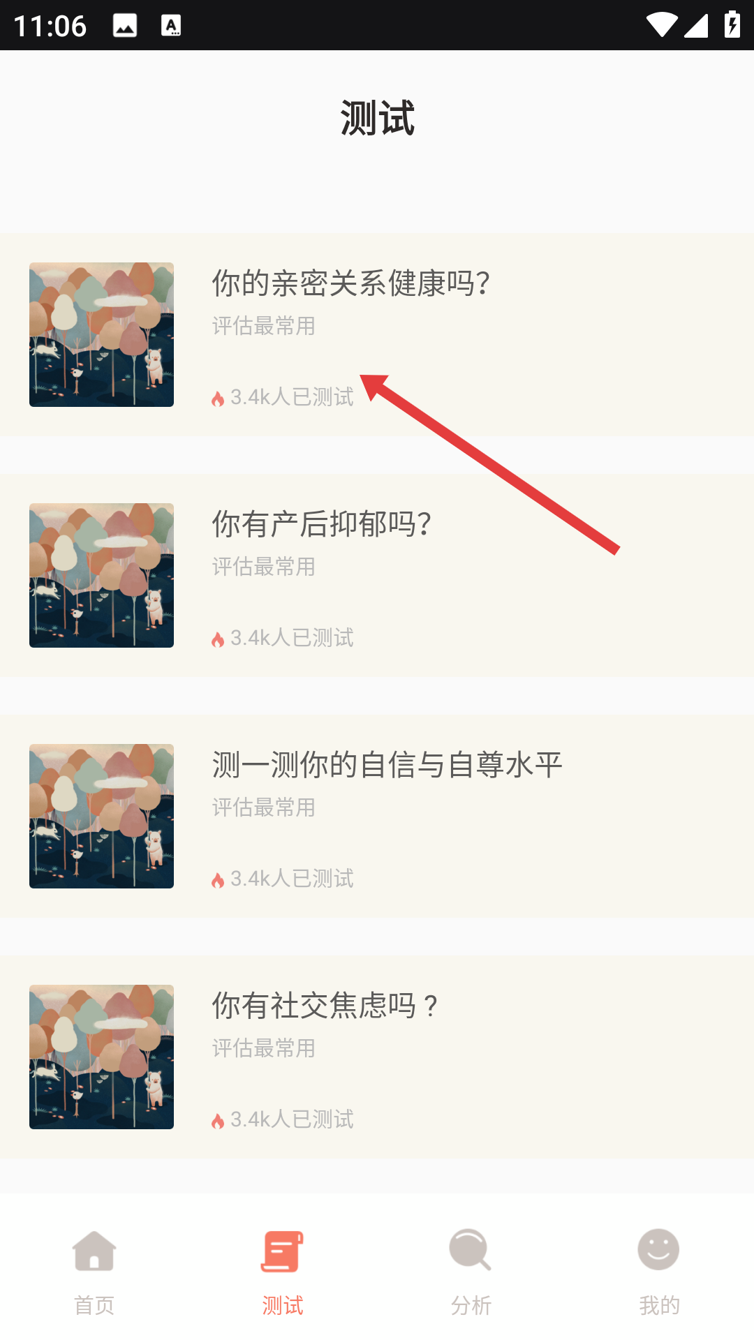 2、在测试界面中,点击【你的亲密关系健康吗?】测试项,进入该测试的介绍页面。