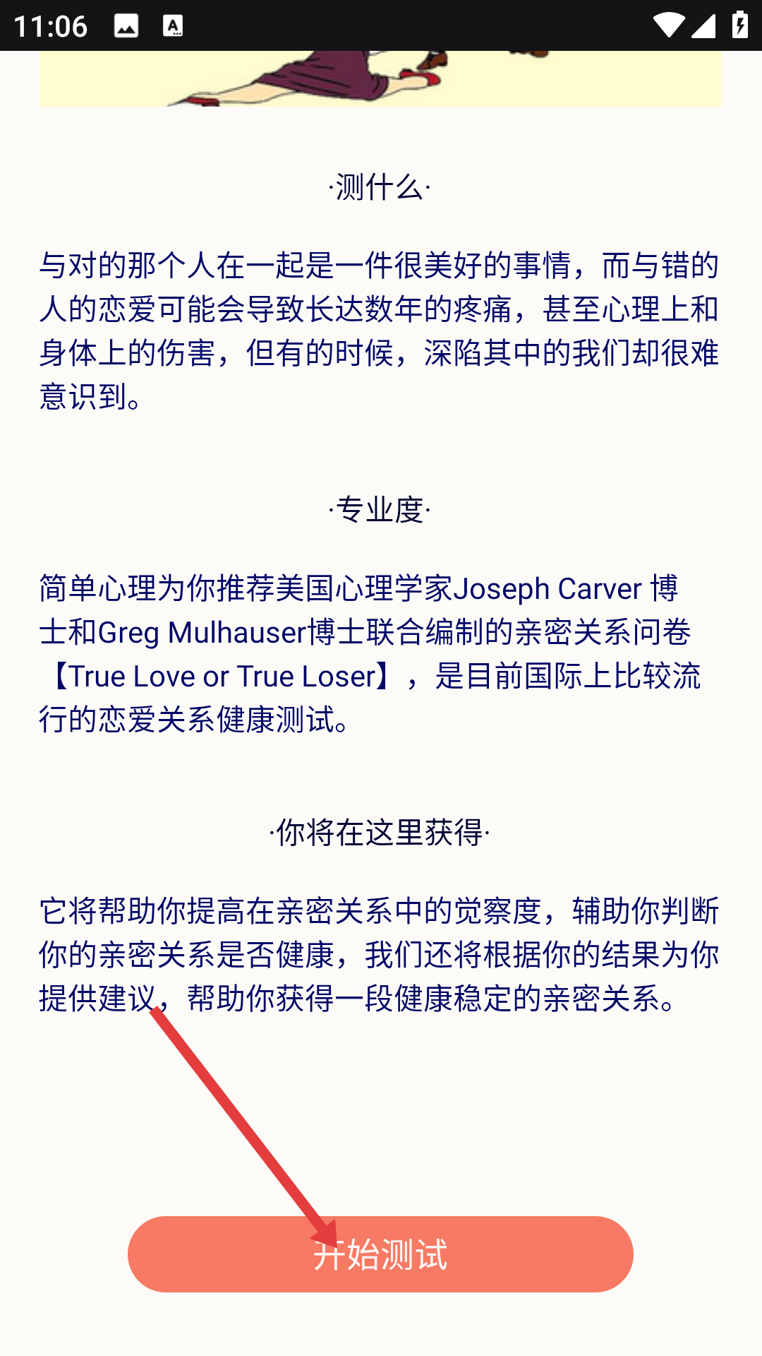 3、在测试介绍页面,点击底部【开始测试】按钮,进入测试答题界面。