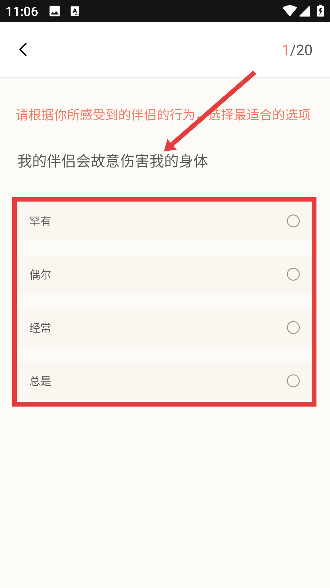 4、在测试答题界面,根据所感受到的伴侣行为,从【罕有】【偶尔】【经常】【总是】中选择最适合的选项进行答题。