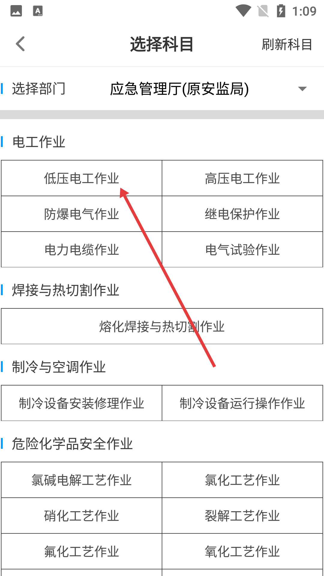 3、在“选择科目”页面,选择对应部门(如“应急管理厅(原安监局)”)下的作业类别(如“低压电工作业”)。