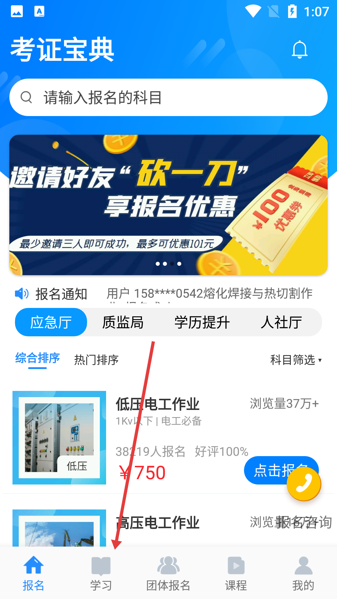 1、打开“考证宝典”APP,点击底部导航栏的【学习】。