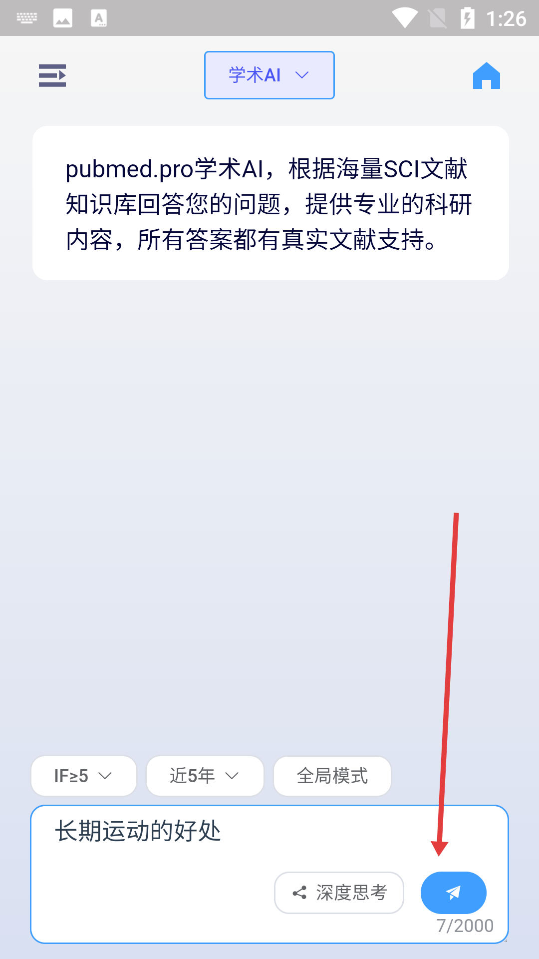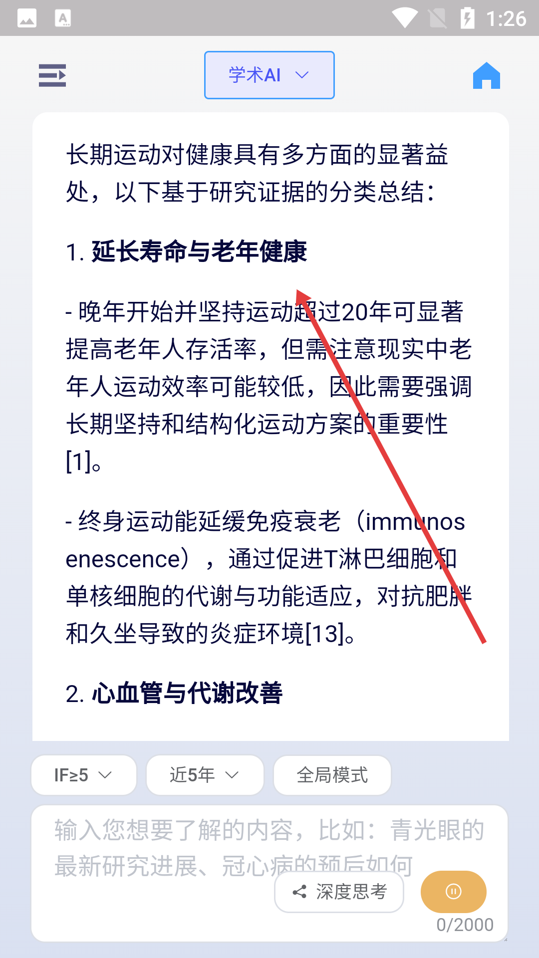 2、在“学术AI”的输入框中,输入想要了解的内容(如“长期运动的好处”)。