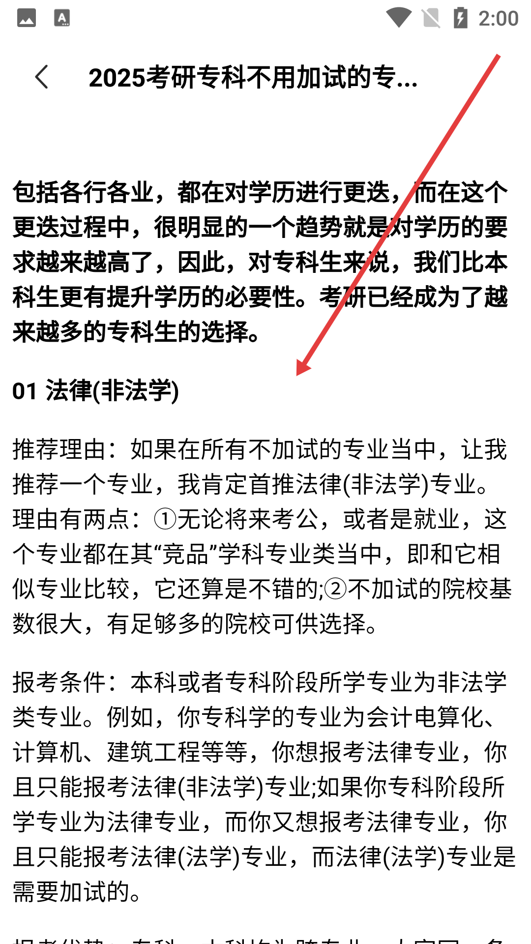 4、进入详情页后,即可查看该问题的详细解答,如“法律(非法学)”专业的推荐理由、报考条件等内容。