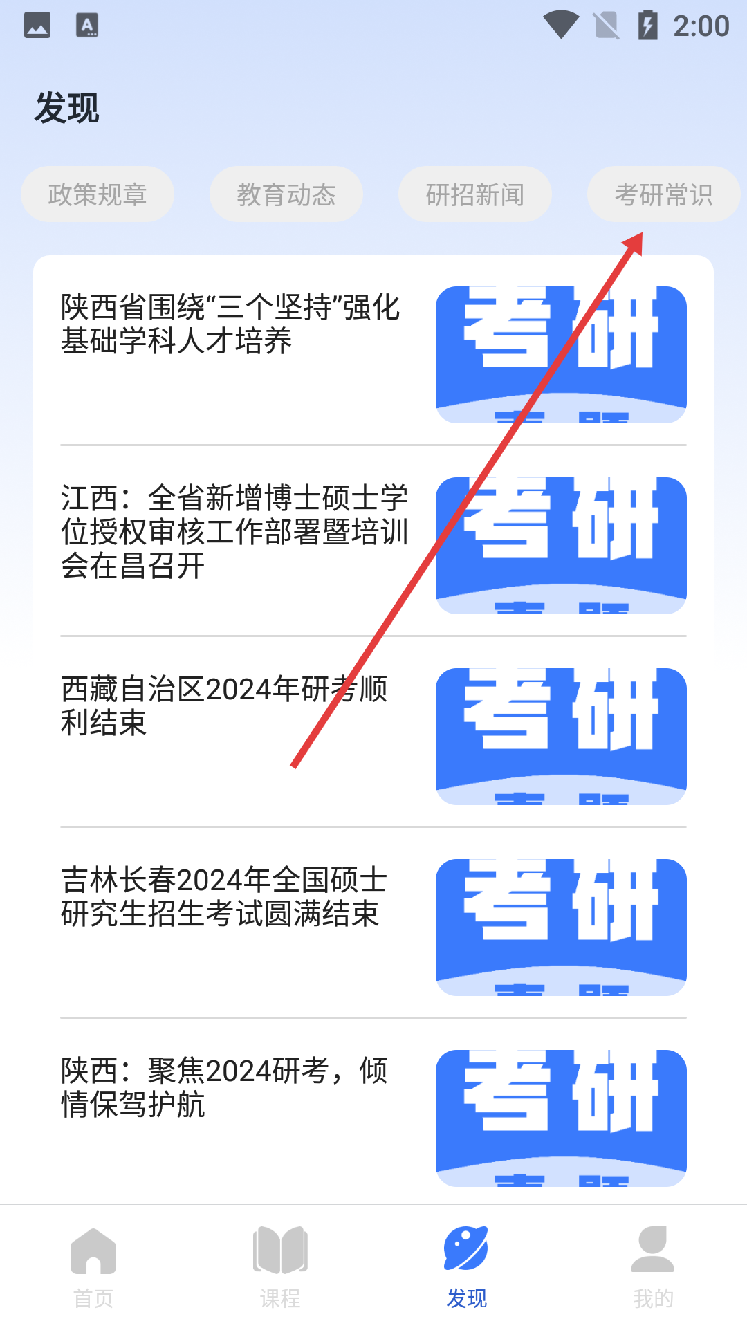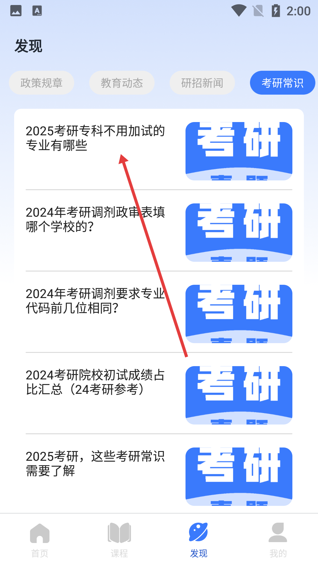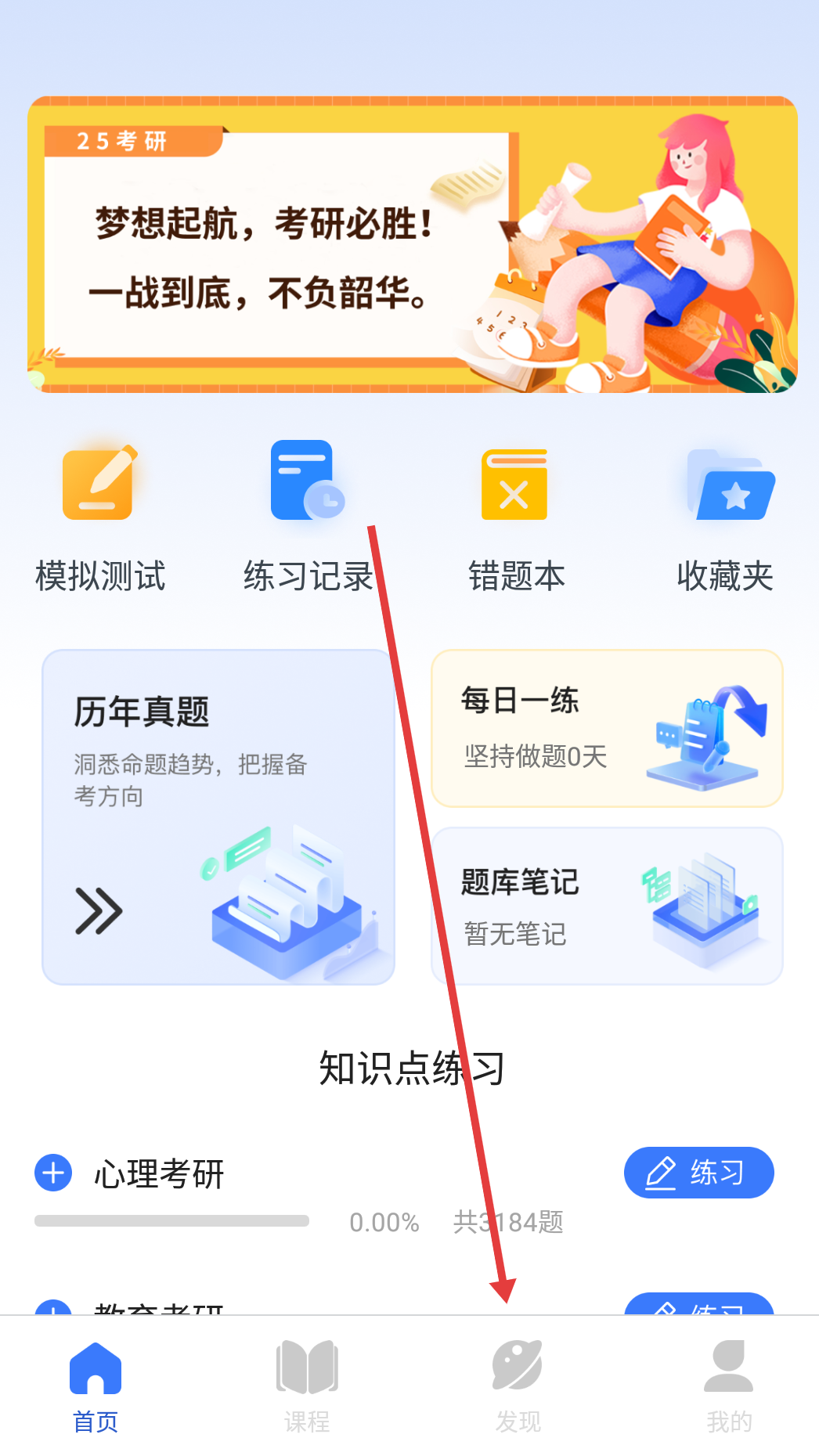 1、打开考研类APP,点击底部导航栏的【发现】。